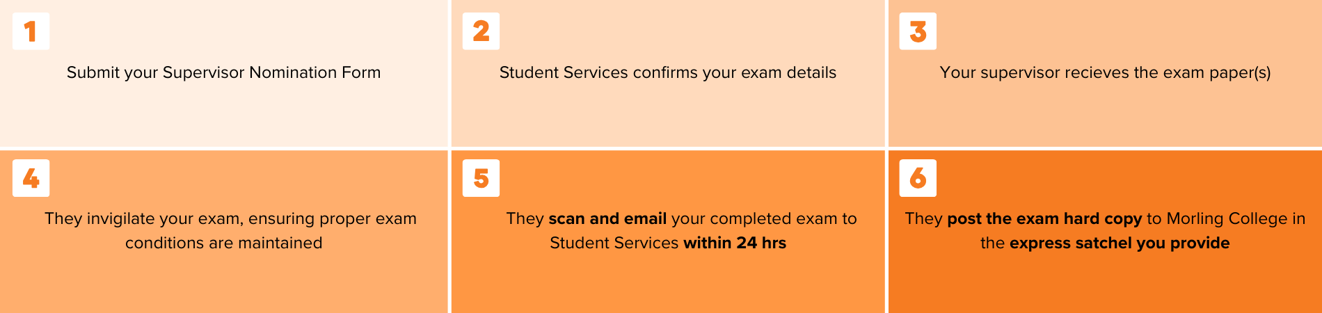 - The supervisor must be able to print the exam paper(s), supervise the exam(s), and scan and email the completed work without any assistance from the student.